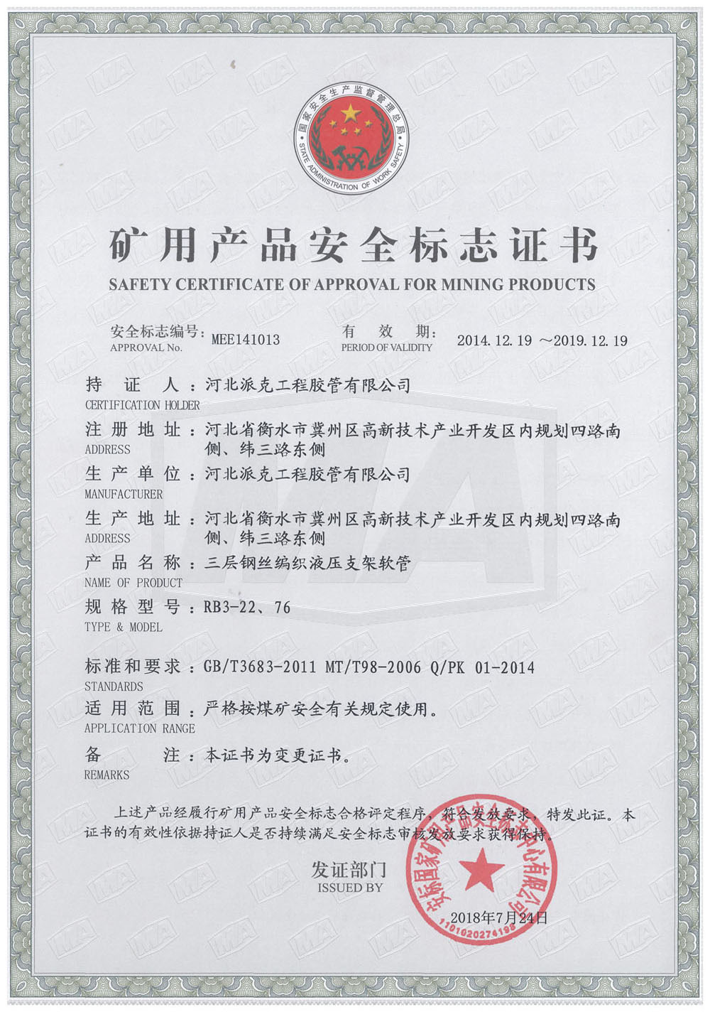 三層鋼絲編織液壓支架軟管證書